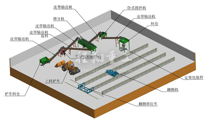 該粉狀有機(jī)肥生產(chǎn)線工藝流程設(shè)計(jì)如下: