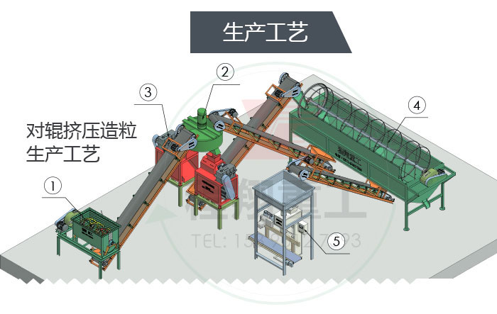 ① 臥式攪拌機(jī) ② 盤式喂料機(jī) ③ 對輥擠壓造粒機(jī) ④ 滾筒篩分機(jī) ⑤ 自動包裝秤