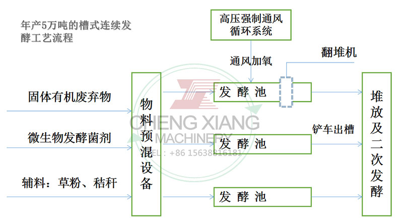 如工藝流程圖所示,每天將畜禽糞便等固體有機(jī)廢棄物與秸稈等輔料混合物及發(fā)酵菌劑充分混合,用鏟車(chē)均勻地送入發(fā)酵池前端(原始空池前端1/8或翻倒完騰出的池前端1/8),發(fā)酵物料在池內(nèi)堆積厚度為1.5~1.8米,靠高壓風(fēng)機(jī)強(qiáng)制通風(fēng)和翻堆時(shí)物料與空氣接觸提供的氧氣進(jìn)行連續(xù)好氧發(fā)酵,使發(fā)酵物料快速腐熟、去水、干燥,發(fā)酵周期7-8天。在翻堆機(jī)縱橫向行走機(jī)構(gòu)的運(yùn)送下,垂直提升機(jī)構(gòu)將發(fā)酵物料從池內(nèi)挖起提升到水平輸送機(jī)構(gòu)上,水平輸送機(jī)構(gòu)將發(fā)酵物料輸送一段距離(8-10米)后落入池中,這樣發(fā)酵物料就在池內(nèi)產(chǎn)生一定的位移,使物料在池內(nèi)有規(guī)律、等距離的漸進(jìn)式后移,每天從發(fā)酵池尾端將發(fā)酵好的物料(一天的處理量,池長(zhǎng)的1/8)用鏟車(chē)運(yùn)走,將發(fā)酵池前端騰出的空間(一天的處理量,池長(zhǎng)的1/8)補(bǔ)充新的發(fā)酵物料,從而形成了一種連續(xù)的發(fā)酵過(guò)程。發(fā)酵翻堆過(guò)程實(shí)現(xiàn)了全自動(dòng)智能化控制。發(fā)酵后的物料堆成料堆儲(chǔ)存的同時(shí)進(jìn)行二次發(fā)酵,進(jìn)一步腐熟并去除部分水分。堆制一段時(shí)間(根據(jù)生產(chǎn)任務(wù)及場(chǎng)地決定)后對(duì)其進(jìn)行篩選、磁選去除其中的石塊、鐵件等,調(diào)整水分(曬干或烘干)即可作為粉狀有機(jī)肥銷(xiāo)售或用作有機(jī)肥造粒原料。