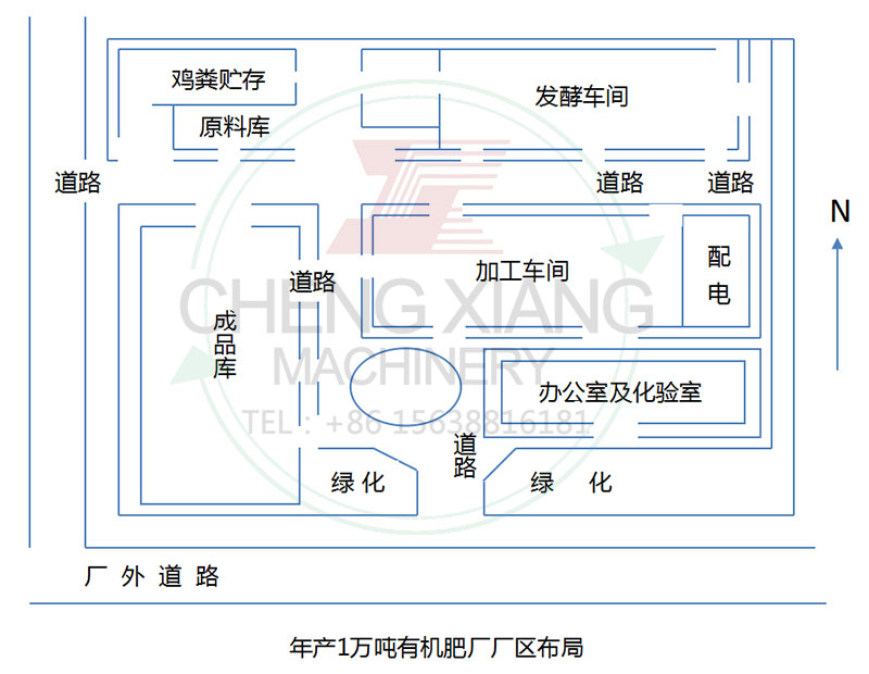 有機(jī)肥廠的廠區(qū)布局一般包括:職工生活區(qū)(辦公區(qū))、設(shè)備存放區(qū)、原料倉(cāng)庫(kù)、發(fā)酵車間、半成品存放區(qū)、加工車間、成品倉(cāng)庫(kù)、辦公區(qū)、種植示范區(qū)